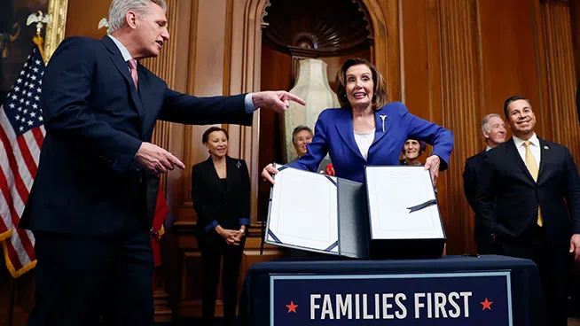 House Speaker Nancy Pelosi of Calif., accompanied by House Minority Leader Kevin McCarthy of Calif., left, and other legislators, participate in a bill enrollment ceremony for the Coronavirus Aid, Relief, and Economic Security (CARES) Act, after it passed in the House, on Capitol Hill, Friday, March 27, 2020 in Washington. The $2.2 trillion package will head to Trump’s desk for his signature. (AP Photo/Andrew Harnik).