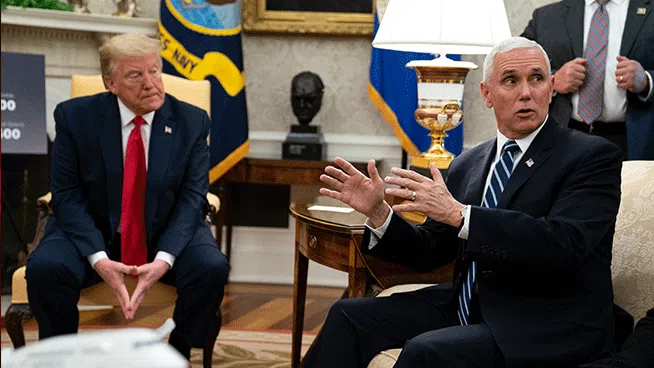 President Donald Trump listens as Vice President Mike Pence speaks during a meeting about the coronavirus with Gov. John Bel Edwards, D-La., in the Oval Office of the White House, Wednesday, April 29, 2020, in Washington. (AP Photo/Evan Vucci).