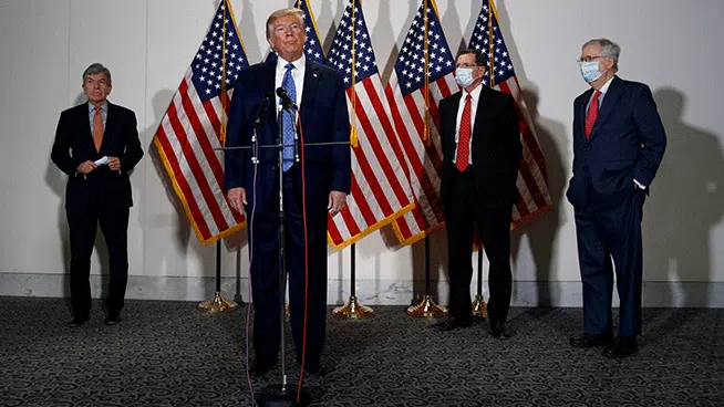 President Donald Trump speaks with reporters after meeting with Senate Republicans at their weekly luncheon on Capitol Hill in Washington, Tuesday, May 19, 2020. Standing behind Trump are Sen. Roy Blunt, R-Mo., from left, Sen. John Barrasso, R-Wyo., and Senate Majority Leader Mitch McConnell of Ky. (AP Photo/Patrick Semansky).