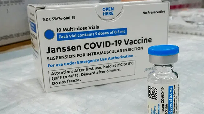 FILE – In this Thursday, April 8, 2021 file photo, the Johnson & Johnson COVID-19 vaccine sits on a table at a pop up vaccinations site the Albanian Islamic Cultural Center, in the Staten Is...