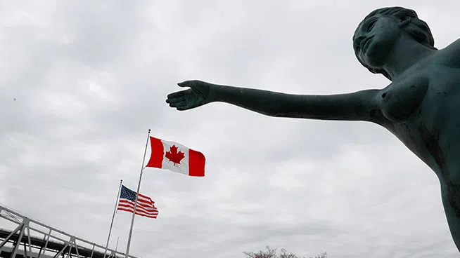 The Blue Water Maiden statue stands at the base of the Blue Water Bridge in Port Huron, Mich., which connects to Sarnia, Ontario, Canada, Wednesday, March 18, 2020. The Canada-U.S. border will be clos...