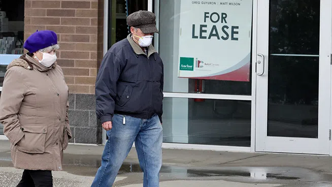 Two people walk past a closed storefront, Thursday, April 16, 2020, in University Heights, Ohio. Ohio has paid a record $227 million to more than 271,000 individuals who filed for unemployment in the ...