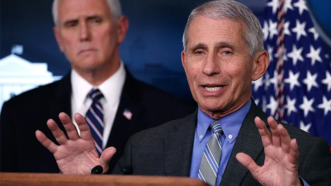 Dr. Anthony Fauci, director of the National Institute of Allergy and Infectious Diseases, speaks about the coronavirus in the James Brady Press Briefing Room of the White House, Wednesday, April 8, 20...