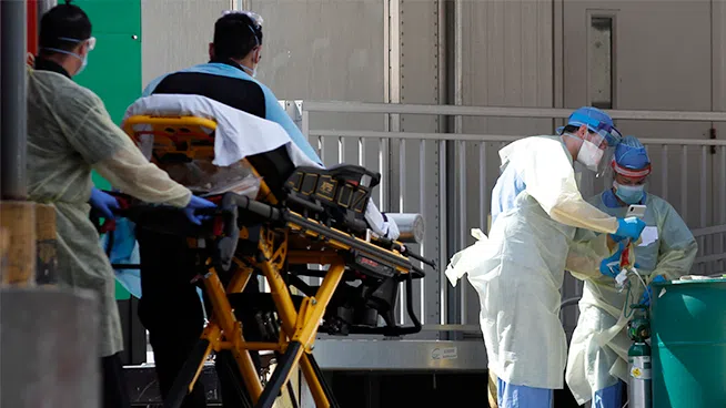 A patient is wheeled past two medical workers wearing personal protective equipment (PPE) as the pair study a cell phone after carrying an oxygen tank out of Elmhurst Hospital Center’s emergency...