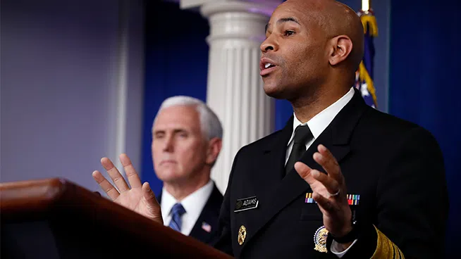 U.S. Surgeon General Jerome Adams speaks about the coronavirus in the James Brady Press Briefing Room of the White House, Friday, April 3, 2020, in Washington, as Vice President Mike Pence listens. (A...