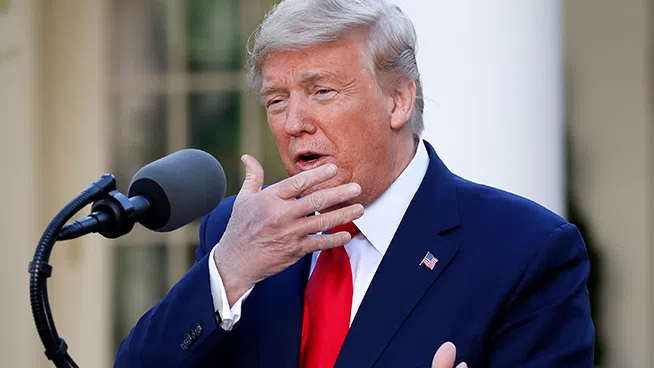 President Donald Trump holds his hand to his face as he talks about masks during a briefing about the coronavirus in the Rose Garden of the White House, Monday, March 30, 2020, in Washington. (AP Phot...
