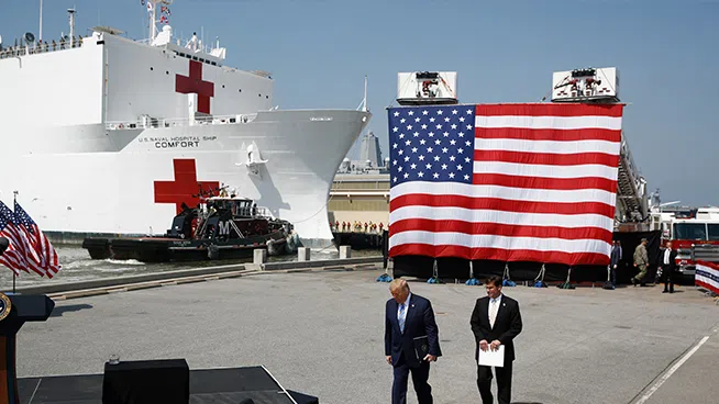 President Donald Trump and Defense Secretary Mark Esper arrive to speak in front of the U.S. Navy hospital ship USNS Comfort at Naval Station Norfolk in Norfolk, Va., Saturday, March 28, 2020. The shi...
