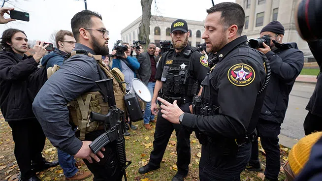 Kenosha County Sheriffs Department officers question a protester carrying a rifle outside the Kenosha County Courthouse, Wednesday, Nov. 17, 2021 in Kenosha, Wis., during the Kyle Rittenhouse murder t...